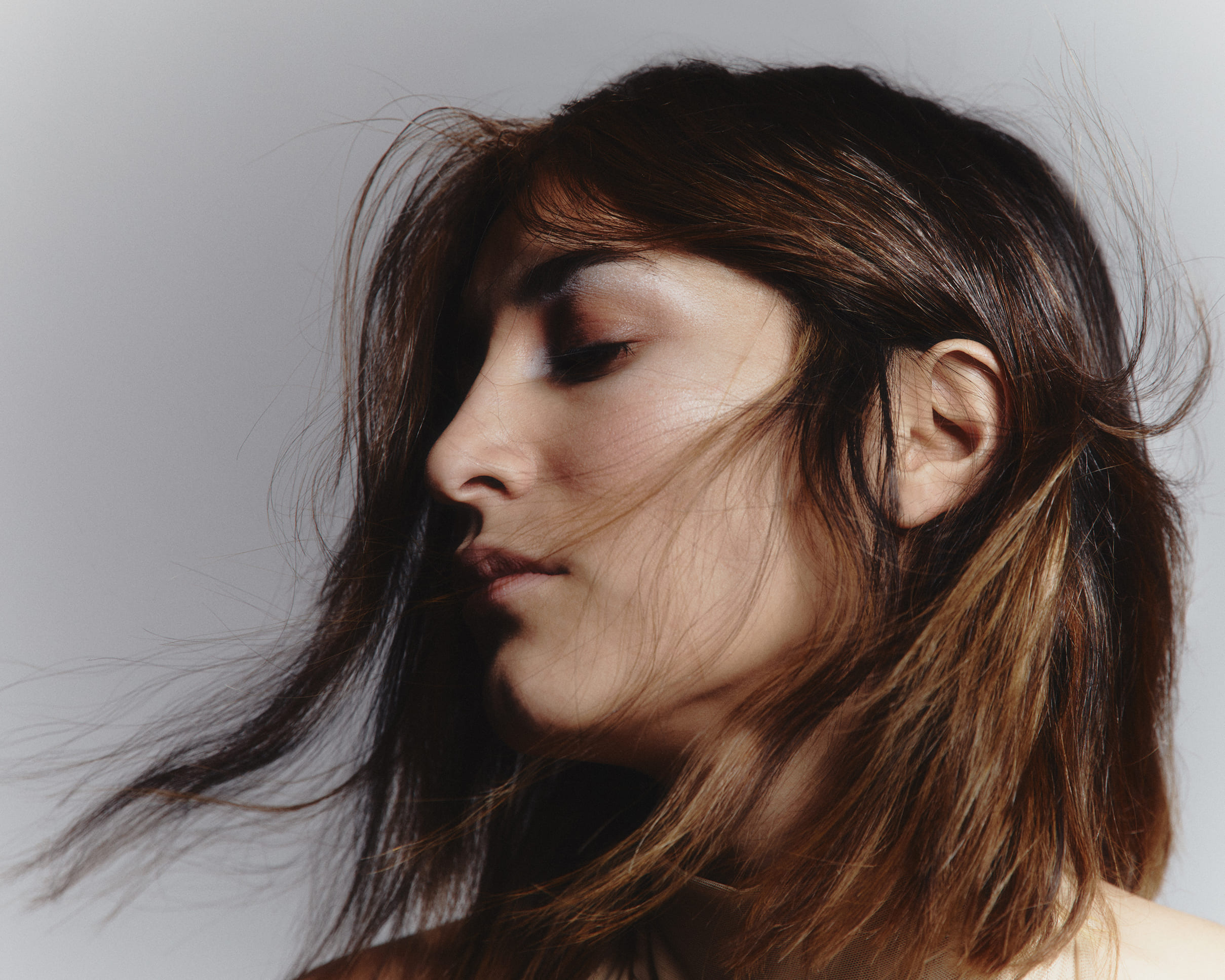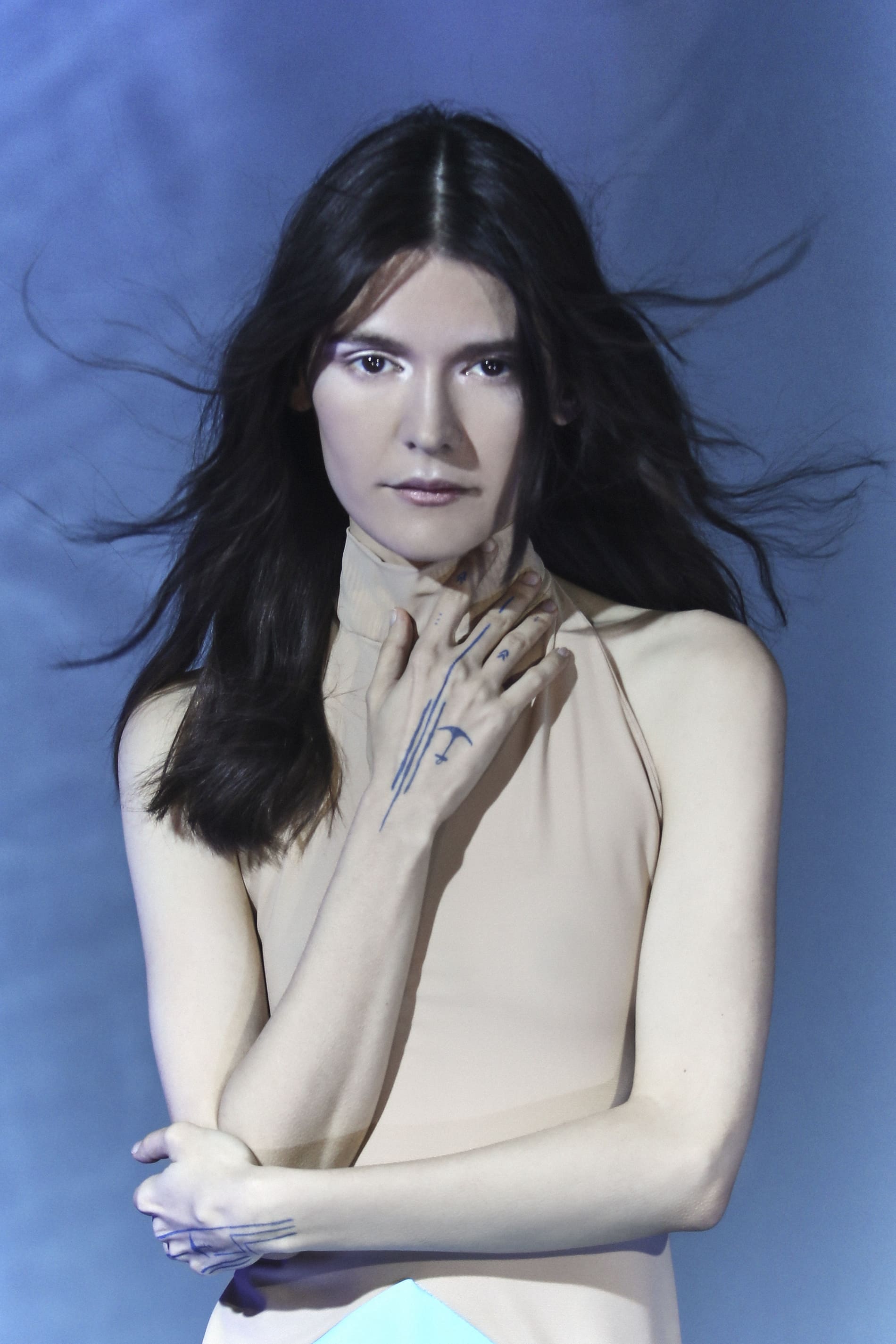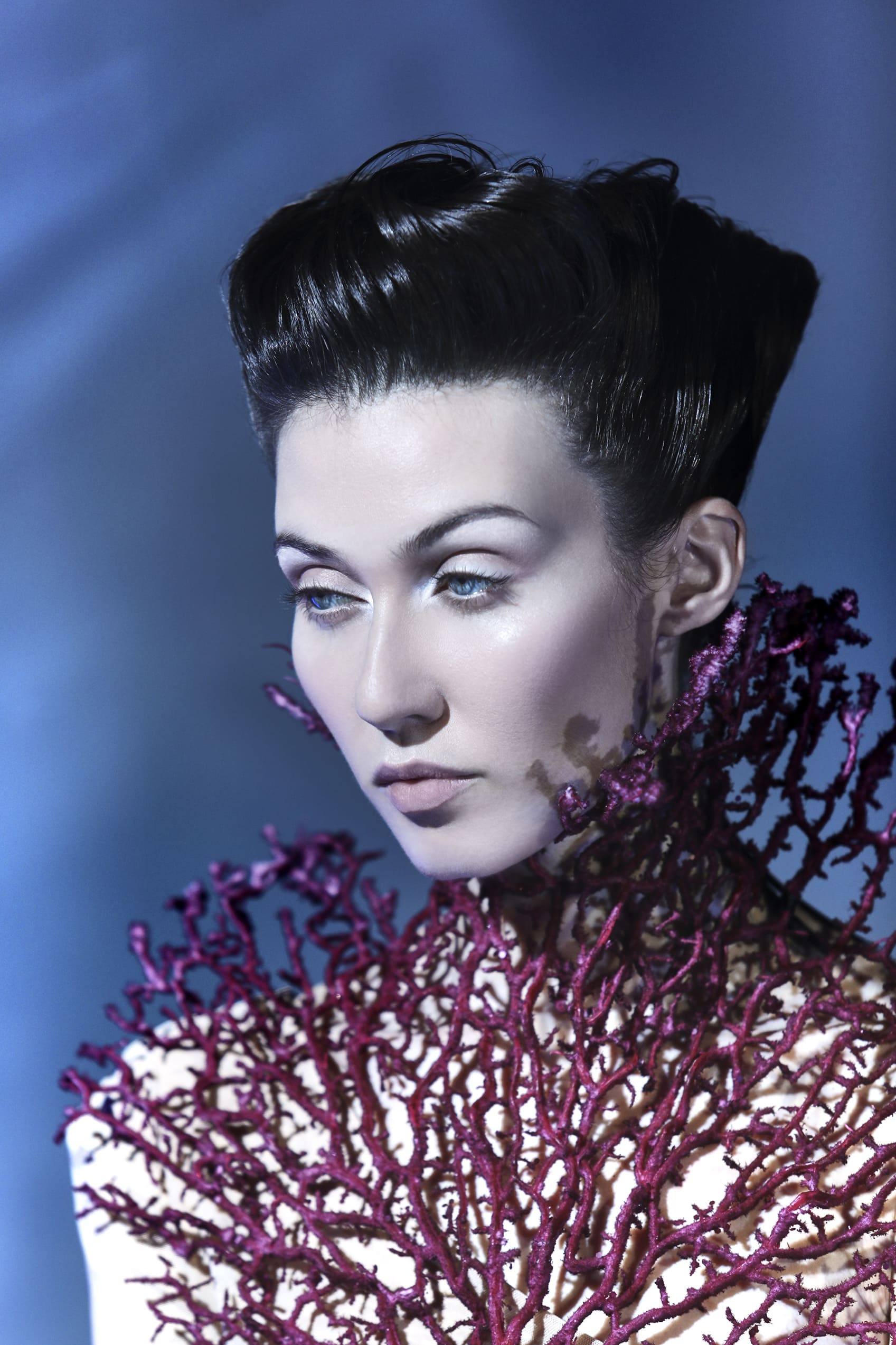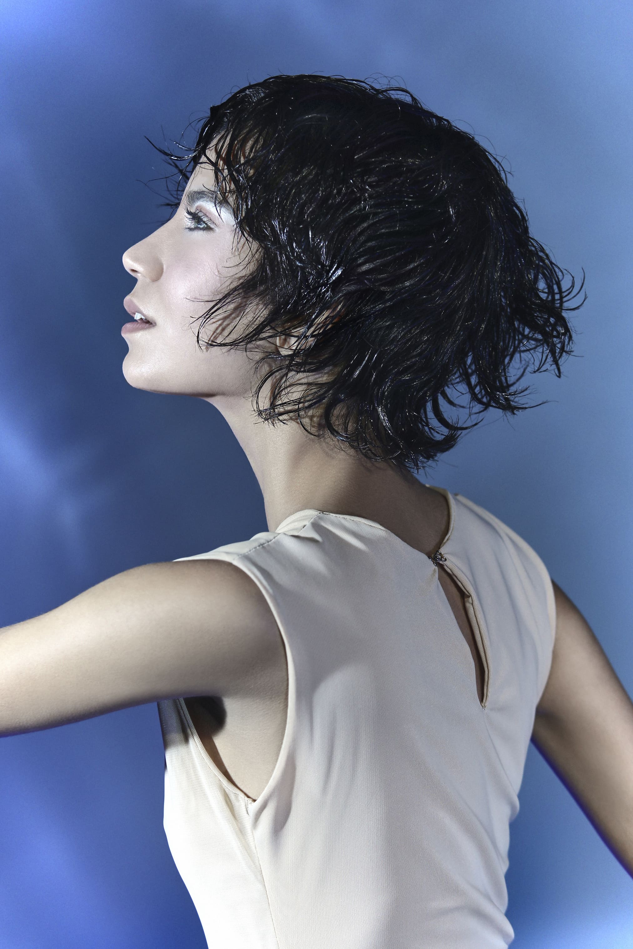 I capelli si muovono con profonda leggerezza, come se si tuffassero nel blu, visioni acquatiche tra sogno e desiderio.