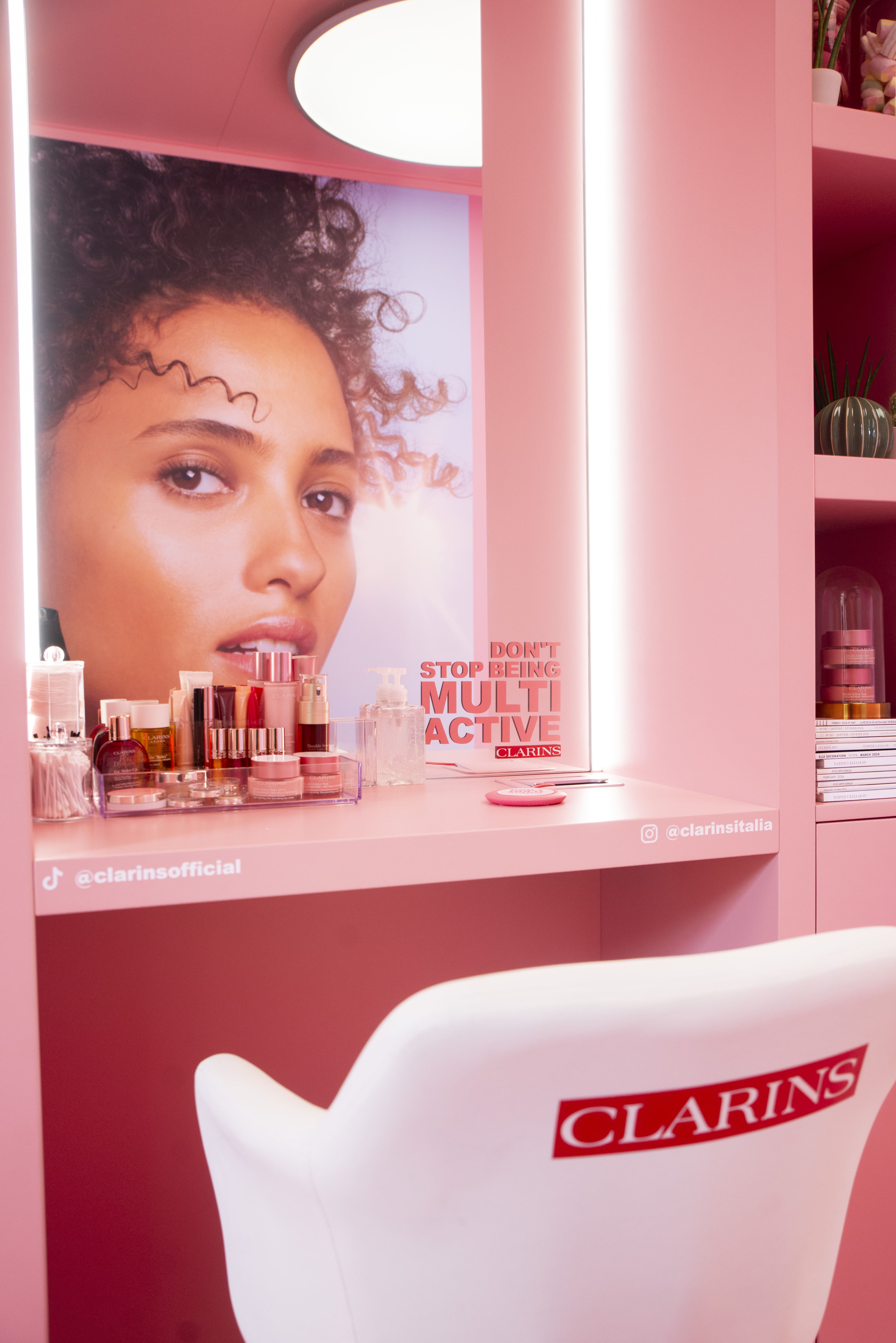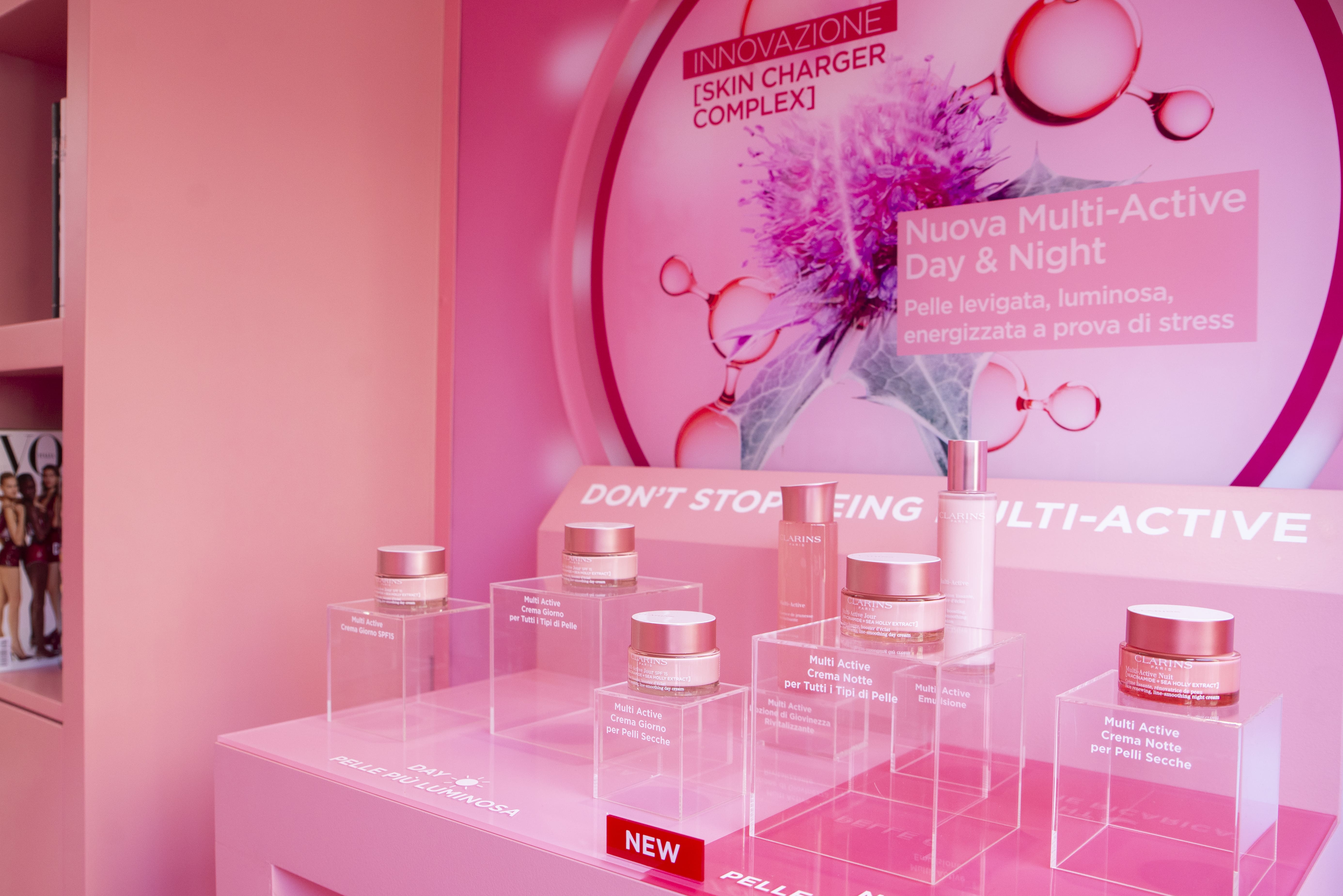 Clarins propone una beauty experience a 360°: un vero e proprio percorso di bellezza a tutta energia dove 6 beauty station invitano alla scoperta e prova della nuova linea skincare Multi-Active Clarins.