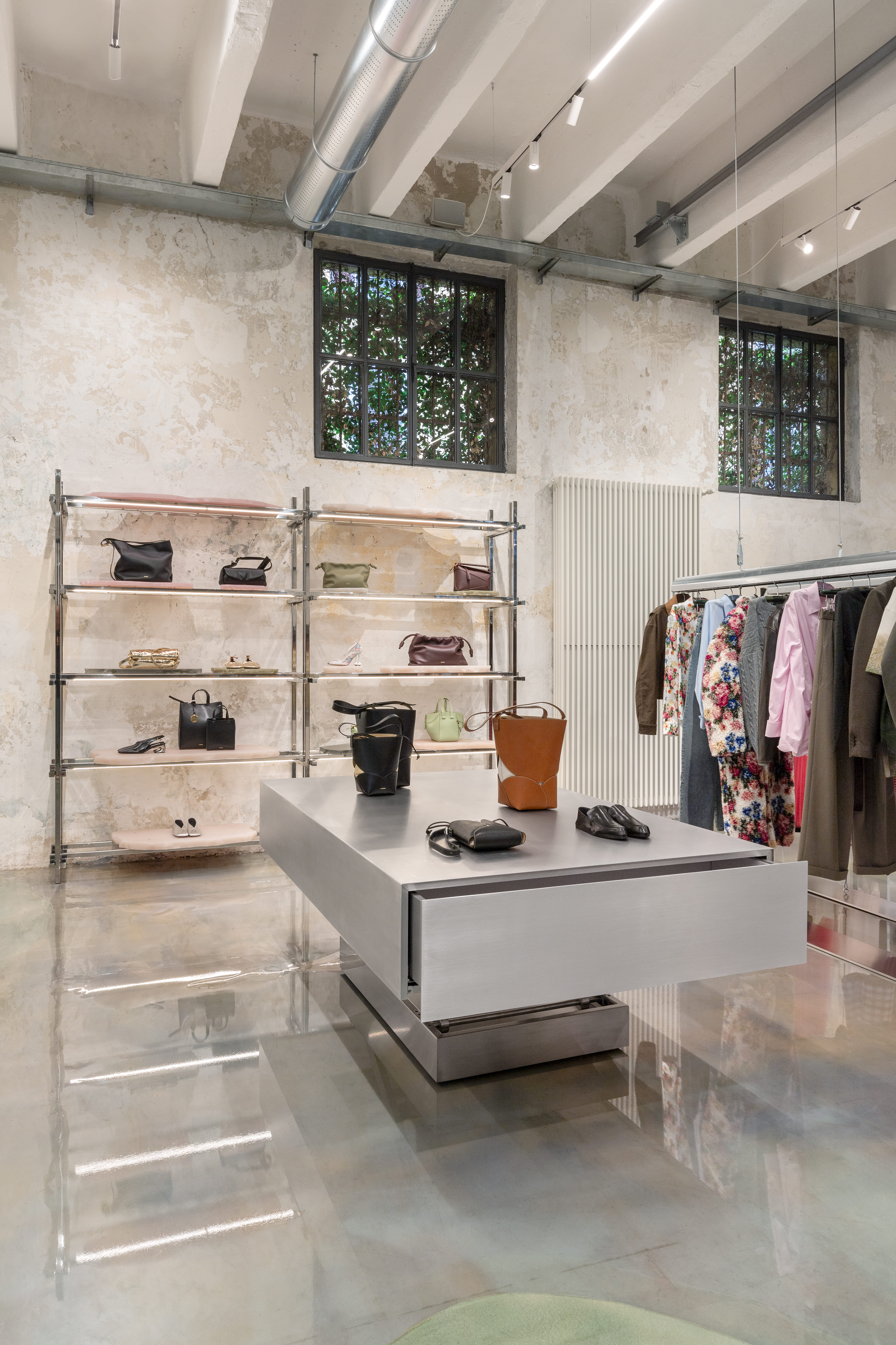 Il nuovo negozio è caratterizzato da dispositivi allestitivi mobili e componibili, come i tavoli pantografo e i rack appendiabiti che si muovono nello spazio. Questi elementi versatili, definiti come unità teatrali dinamiche e leggere, offrono infinite possibilità curatoriali, permettendo di creare configurazioni sempre diverse per esporre moda, arte e design.