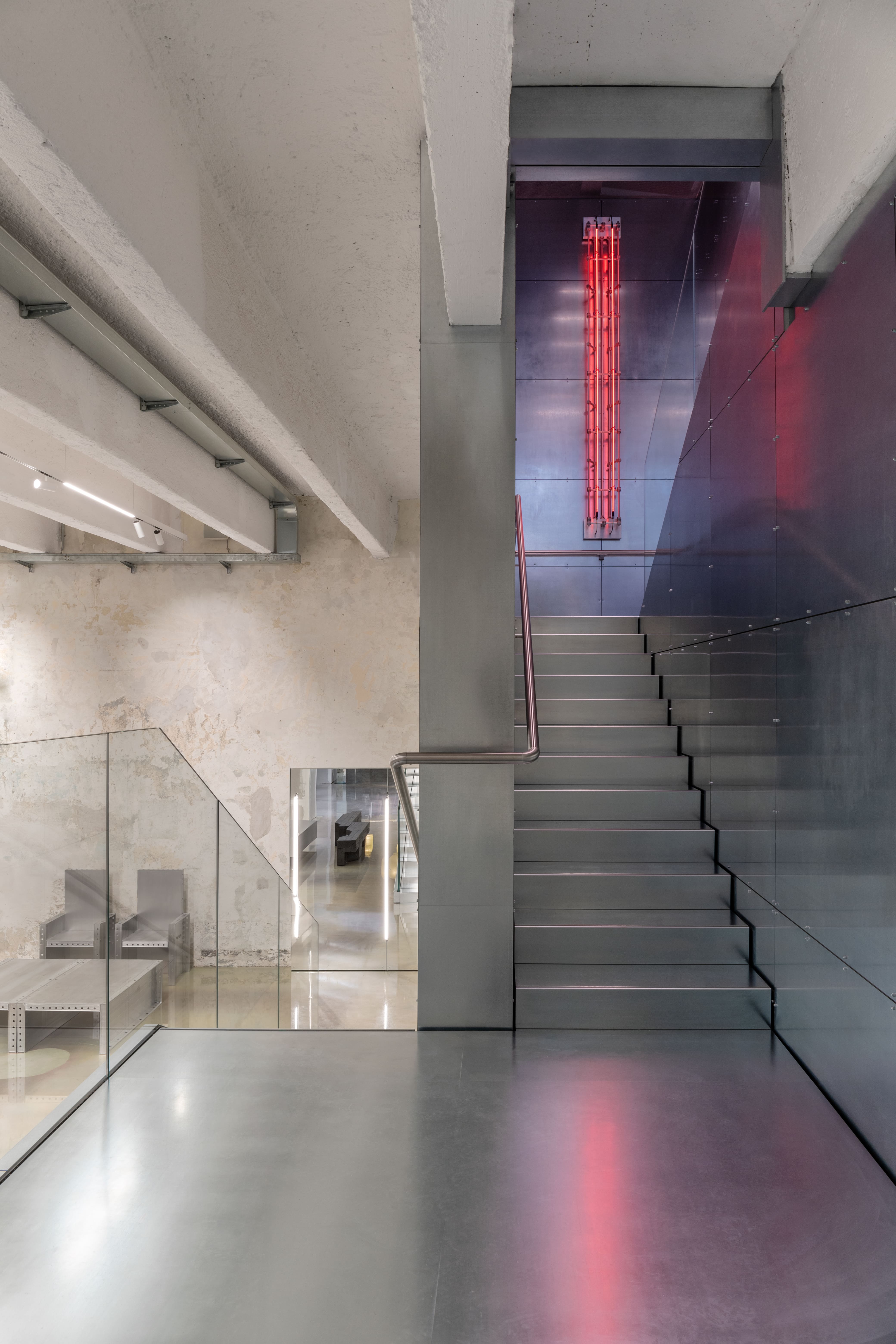 La nuova scala interna, interamente rivestita in acciaio, connette il piano terra agli spazi superiori, creando un collegamento fluido tra i vari livelli del negozio. Questo elemento architettonico non solo rappresenta un elemento di design di grande impatto, ma offre anche ai clienti un percorso attraverso un ecosistema innovativo che unisce moda, arte, design e food in un’esperienza di shopping immersiva e unica.